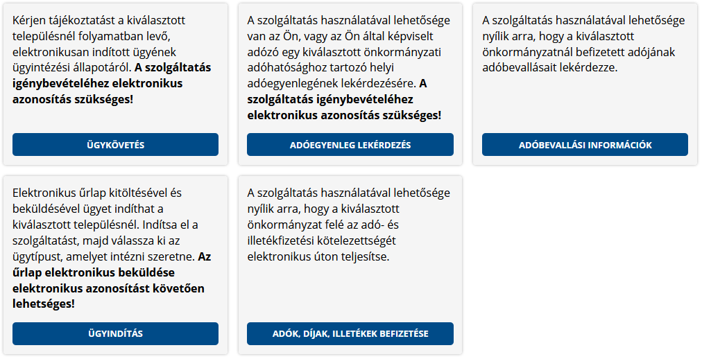 Személyes megjelenés, postai sorban állás nélkül küldhetik be kérelmeiket, bevallásaikat, ellenőrizhetik adószámla kivonatukat, feldolgozott bevallásaikat megtekinthetik és ingyenesen fizethetnek bankkártyával adót, díjat, illetékeket a kiválasztott önkormányzatnál.