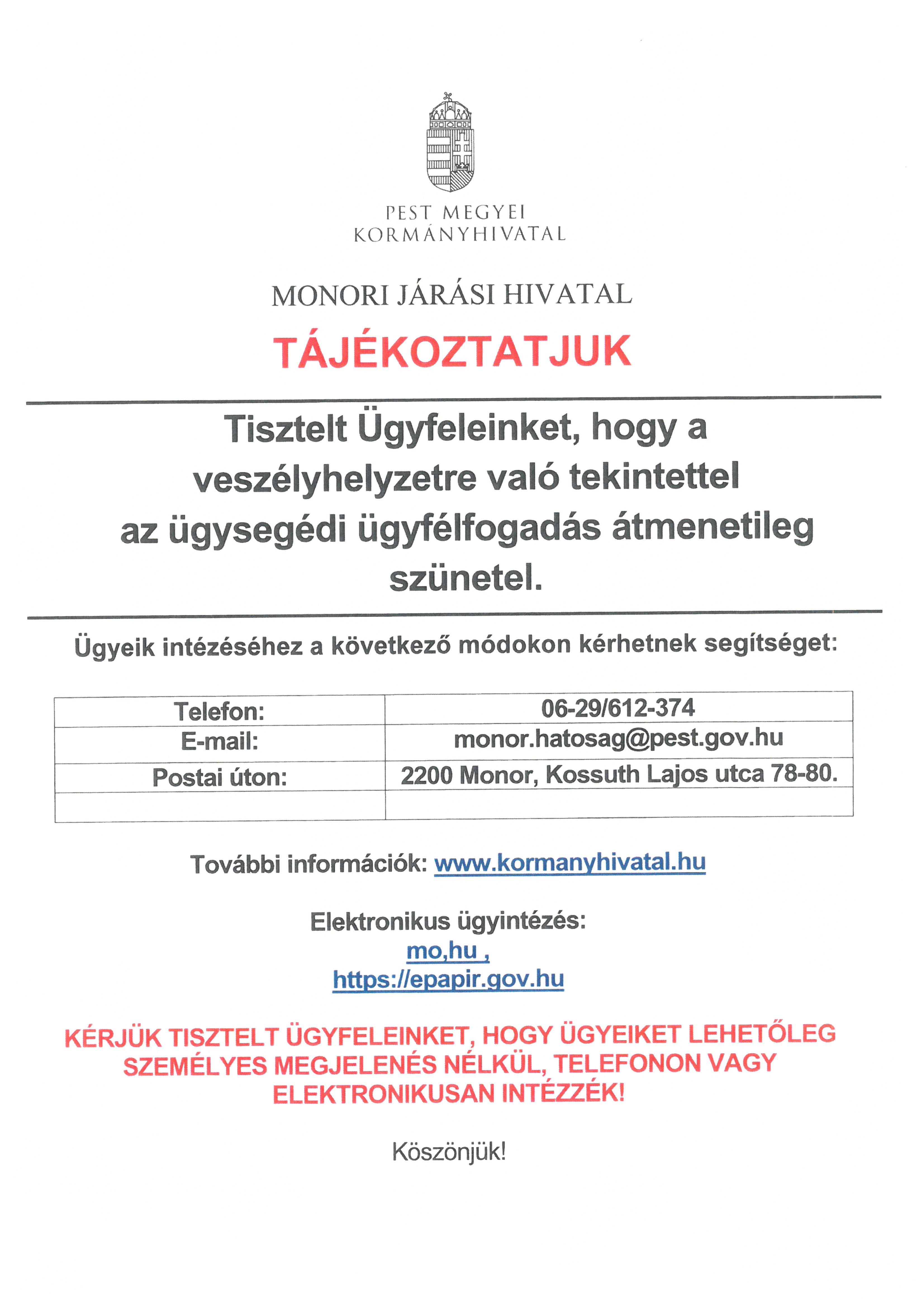 KÉRJÜK TISZTELT ÜGYFELEINKET, HOGY ÜGYEIKET LEHETŐLEG SZEMÉLYES MEGJELENÉS NÉLKÜL, TELEFONON, VAGY ELEKTRONIKUSAN INTÉZZÉK!